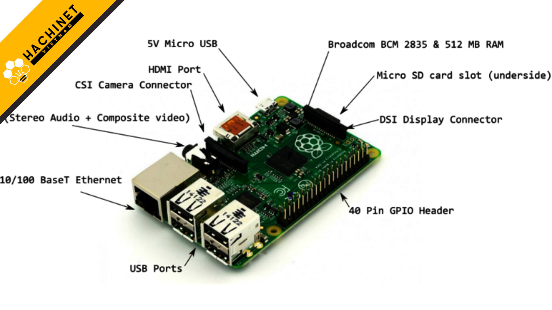 Các kết nối của Raspberry Pi với các ngoại vi là module, cảm biến đều qua các vị trí này để kết nối với Raspberry Pi.